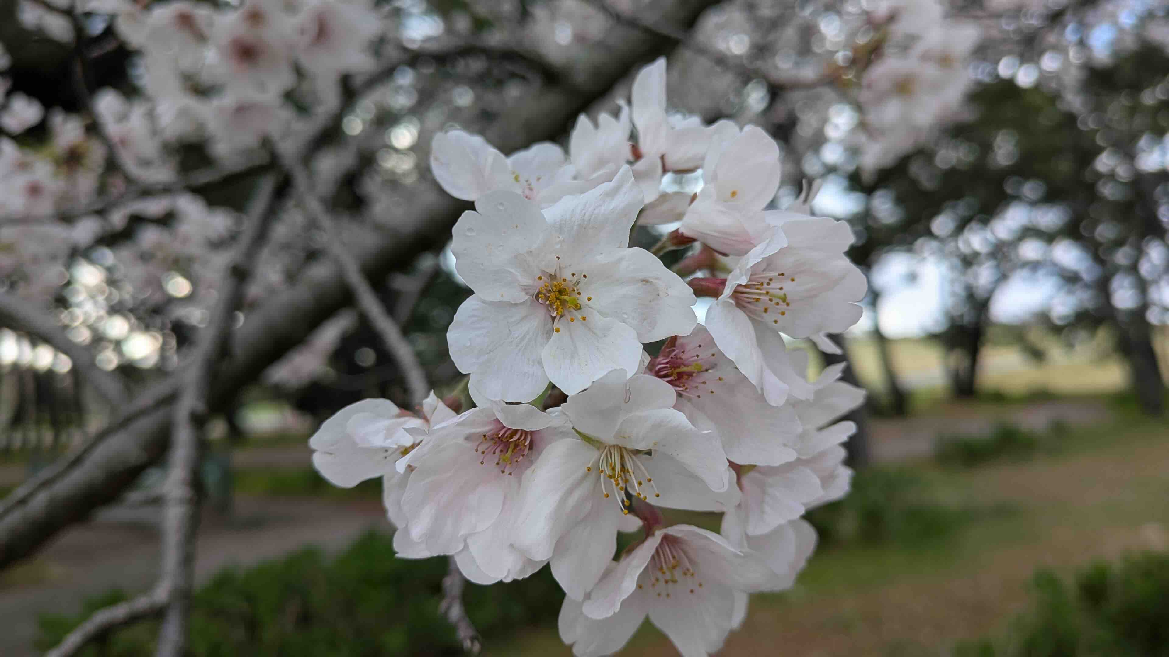 薄暗い中でも桜はちょうど見頃で、公園のそこいらで美しく咲いている。久しぶりに桜並木もルンルンで通った。